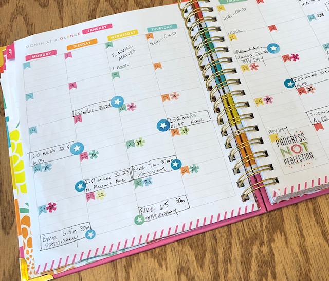 These times and miles I add to my monthly calendar spread, to see my progress.